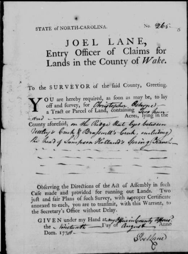 An earlier theory about the Town’s name points to a mistake on official documents dating back to the late 1700s. The record shows local land recorded as “including the head of Sampson Holland’s Spring Branch” (see image). When nearby land was surveyed in 1779, the name of the branch previously identified as “Holland’s Spring Branch” was recorded as “Holley Spring Branch.” This spring is located inside Mims Park in downtown Holly Springs, a short walk from the trailhead near the Cultural Center.