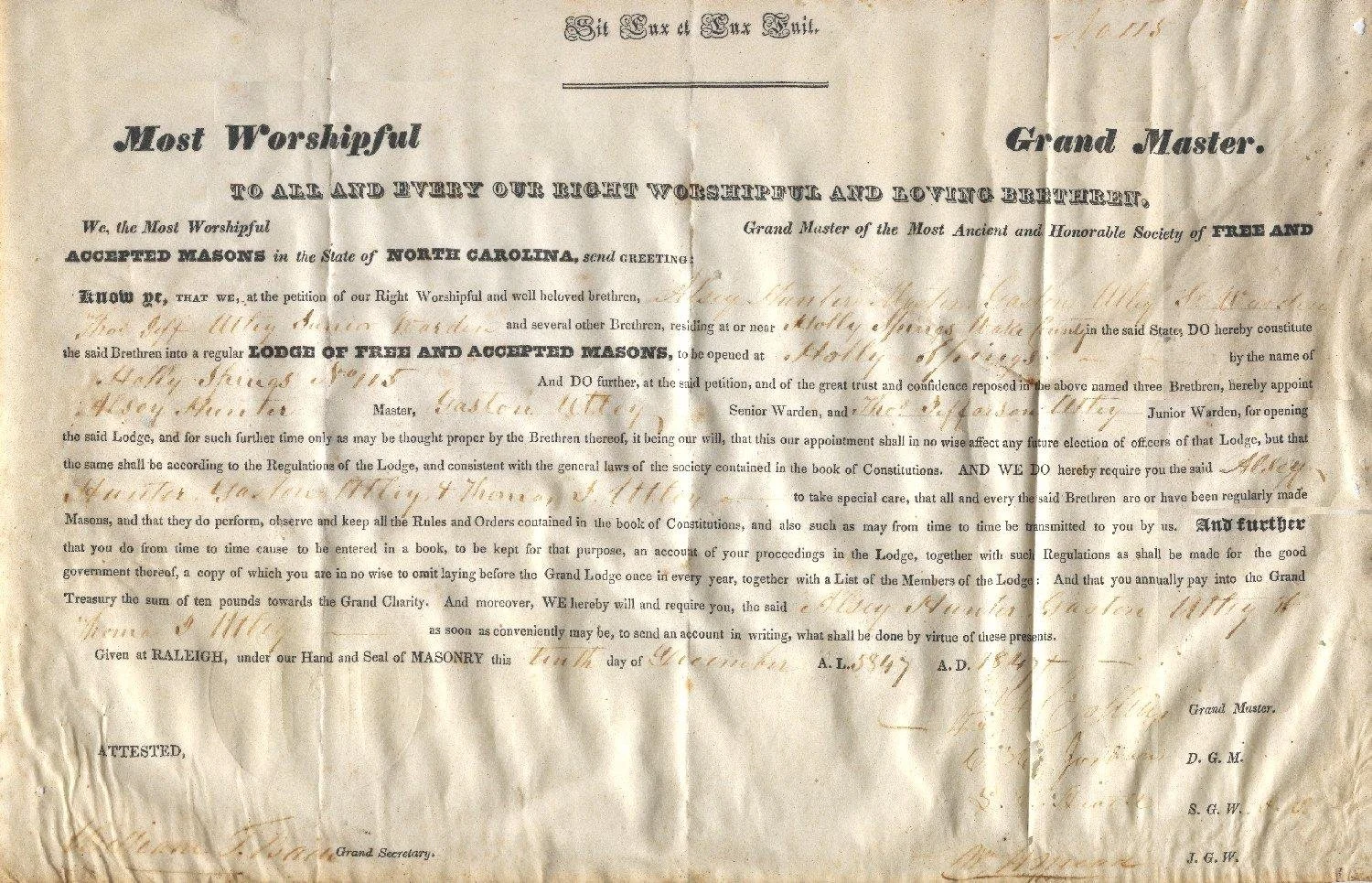 Despite this setback, several of the members of Western Sun Lodge were able to reorganize in what is today the Town of Holly Springs, where a new charter was granted on December 10, 1847, for Holly Springs Number 115. The first Master of the lodge was Alsey Hunter, and he led the lodge during the early days of building construction and meetings, which were held in the home of Richard Jones from 1847 to 1848.